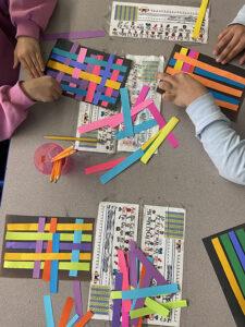 After this class I joined teaching artist Briget again. She also began her class on the rug, leading an engaging discussion on the artist that was the inspiration for that day’s activity: Diedrick Brackens. She had them look at images of his art and think critically about the material, process, patterns, and shapes. This gave the students the opportunity to show off vocabulary and art knowledge they had learned in Briget’s classes previously! Next, she demonstrated the activity, which was paper weaving inspired by Bracken’s tapestries. Then students sat down at their tables and we passed out paper and strips of paper. They got to pick the colors, and we helped them tape the strips to the top of the paper so they could weave with them. At the end of that process, we helped tape down the edges and the students got to draw over the patterns however they chose. We saw so much creativity coming out here! Finally, Bridget invited the students back to the rug and they got to share their artwork with their classmates. The next two classes with Briget went similarly, and I was glad to be part of another artistic and educational day at PS15!