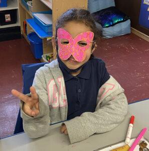 On Wednesday, March 5, I rejoined three of Rathi’s classes at PS15. This was the first week of Women’s History Month, so Rathi had chosen to focus on artist Yayoi Kasama. Before the lesson, though, we began in a circle on the rug and Rathi invited each student to share something unique about themselves. Then, she led students in a warm up, dancing and stretching and getting excited for art making. She shared a presentation to teach the kids about Yayoi Kusama, a Japanese-born contemporary artist known especially for her large scale installation and sculpture and her consistent use of polka dots. The kids had previously expressed interest in making art they could wear, so this week Rathi led an activity in which they created masks in the style of Yayoi Kusama. First, she demonstrated the process, and then invited students back to their tables to make the polka dot masks step by step. The kids were excited to try the masks on afterwards, and thrilled with the knowledge that they would be able to take them home.