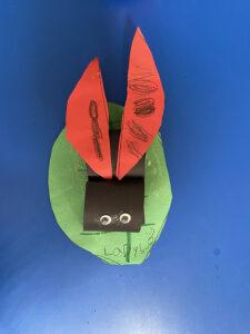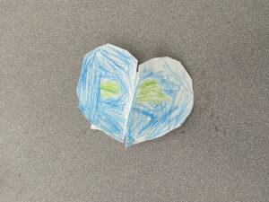 In her class, Briget was continuing the spring theme, but instead of focusing on a bug this week, she led an Earth Day inspired craft, as Earth Day was the day before. She introduced the activity by leading a discussion on what it means to take care of the Earth and the ways we have the power to do so. The kids came up with lots of good ideas, and started to think about “Earth Day promises they could make, promises to themselves and the planet of one thing they would do to be kind to our environment. Then, we handed out materials for the craft. We were making little heart-shaped Earths that folded open to reveal messages (the Earth Day promises). We used pre-drawn hearts, which the kids just had to follow the lines to cut out, rectangular strips of paper to attach it to for the messages, and blue and green colored pencils. Their messages read statements like, “I can recycle!,” and “I will throw away my garbage and not litter,” or “I will do my best to love Earth.” It was a lovely little activity that inspired the students to be thankful for the natural environment and think about ways they can support it, even as kids.