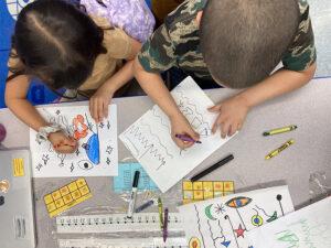 On Wednesday, April 23, I went back to PS15. I assisted with four classes: two kindergarten and one first grade with Rathi again, and one second grade with Briget again. In Rathi’s classes, we started as usual with a warmup on the rug. Rathi plays music and leads some stretches, simple repetitive movements, and balances to get everyone’s brains and bodies ready for an exciting art class. The activity today was based on the artist Joan Miro, a Spanish painter who was known especially for a playful and childlike abstract art style. Rathi told the students about the artist and shared some of his work in a brief presentation before leading a demonstration of the project. We also taught them the word “overlap,” and explained what that meant in the context of Miro’s art and the project for today, practicing overlapping lines, shapes, and colors. Then we sent the kids back to their tables to create! Rathi had kids first use black markers to write their names largely in different kinds of lines, like zigzag or squiggly lines, on a piece of white paper. Next, they used the same markers to create shapes and lines overlapping their names and around the page. Then, I passed out crayons to add color, so they filled in the shapes and added colorful elements to their name art. At the end of each class, we brought the kids back to a circle for a physical cool down, taking deep breaths and engaging in light stretching follow-the-leader style. Rathi also asked a few questions about what they learned that day about the artist Joan Miro or art skills in general before prompting one last deep breath that led into the students’ usual chorus of “I did it! I am proud of myself!”