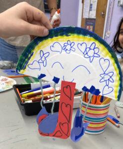 I also supported Briget in her classes today. She had planned a rainy-day umbrella craft. First, we talked to the students about the current spring season and what changes are happening in the weather, what they notice about flowers and pollinators (and pollen allergies), and the good and bad things about rain. Bridget taught them the phrase, “April showers bring May flowers,” which they chanted and got them excited for the rain-themed activity. The craft was an umbrella, made out of half a paper plate, cane-shaped paper cutouts for the handle, teardrop-shaped cutouts for the rain, and string to hang the raindrops from the umbrella. Briget held her example up to ask the students what materials they noticed (paper plate, paper, tape, glue, and markers or other coloring supplies) to explain to them the process of making it. Then, students went to their seats and we passed out the materials one at a time to create their umbrellas. We went step-by-step again, which is definitely helpful with this age group. They all decorated their umbrellas so creatively as well, one with cats for “it’s raining cats and dogs,” and many with cute little faces on the front. At the end of class, we went back to the rug to share everyone’s work. Briget had one student at a time hold up their finished product while the others “oohed” and “aahed,” and then they got to shake them to show off their rain dance while the raindrops bounced around. It was quite cute and another great April activity for the last class in April.