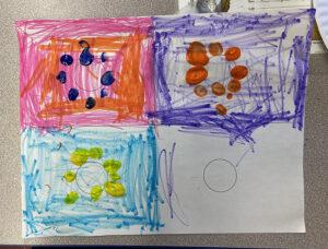 Today, April 30th, I returned to PS15 for my second-to-last day there as part of my internship. I am sad it’s almost over! On this day, I started in one of Rathi’s kindergarten classes again. The kindergarteners came in with a lot of emotion and energy, so instead of the typical high-energy warm up, Rathi started with a calmer breathing meditation that was similar to the cool down we normally do at the end of class. Then, she shared a bit about the artist Andy Warhol, showing pictures of some of his famous work like the soup cans, flowers, and Marilyn Monroe screen prints. She invited the kids one at a time to share what they noticed about the art, especially about bold colors. We noticed patterns and taught them the word “repetition,” and what that means in art, and then Rathi demonstrated the activity for the day. On a printout of four squares with circles inside, she filled in each square using markers in a different bold color, and then fingerpainted using contrasting colors to make flowers around the circle. Once everyone was clear on the directions, we sent students back to the tables to start their artworks. I was impressed with their knowledge of color and loved how bright the finished pieces were!