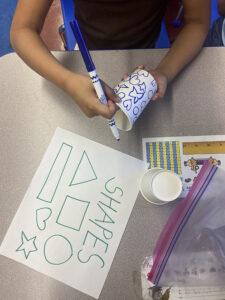 Next, Rathi offered the students three choices for the activity, to focus on line, shape, or texture. She demonstrated what we would be doing: decorating paper cups with whatever choice they made, making shapes, different lines, or using paint to create textured dots on the surface. Once the students were finished with their cups, we collected them all and stacked them into a tower, which we called a community tower. The community tower celebrates the students’ learning and accomplishments in art class thus far and highlights their artistic, collaborative community. It was so fun to highlight and celebrate the culmination of their learning through this project!