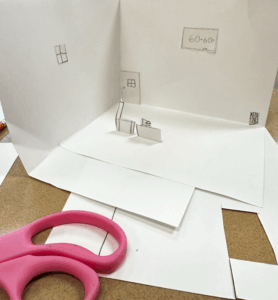 As students learned vocabulary for classroom elements like desk (桌子: Zhuōzǐ), chair (椅子: Yǐzǐ), and door (门: Mén), they simultaneously designed and constructed those elements as 3D paper models for their imagined classrooms. Briget led demonstrations on folding techniques, showing how a flat sheet of paper could transform into a dimensional piece.